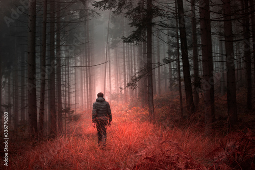 Man Walking Alone In Magical Dark Orange Red Colored Foggy Wild Forest Landscape Buy This Stock Photo And Explore Similar Images At Adobe Stock Adobe Stock